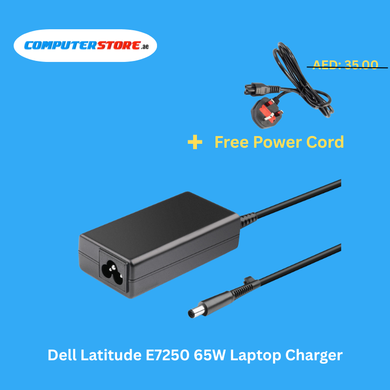 Reliable Dell Latitude E7250 65W Laptop Charger with a free power cable, delivering steady 19.5V output with 3.34A current for efficient, safe, and dependable performance.