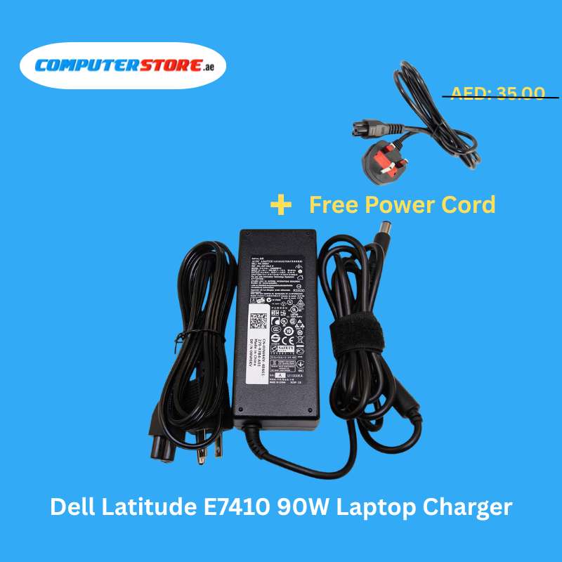 Durable Dell Latitude E7410 90W Laptop Charger with a free power cable, providing consistent 19.5V output with 4.62A current for secure, powerful, and long-lasting performance.