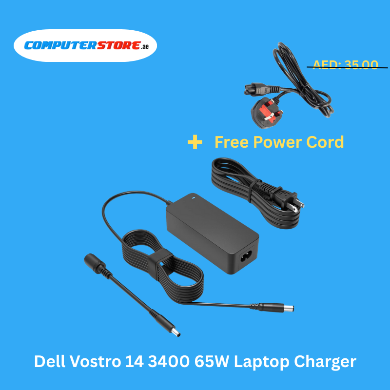 Reliable Dell Vostro 14 3400 65W Laptop Charger with a free Power Cable, delivering stable 19.5V and 3.34A output for fast, safe, and efficient charging.