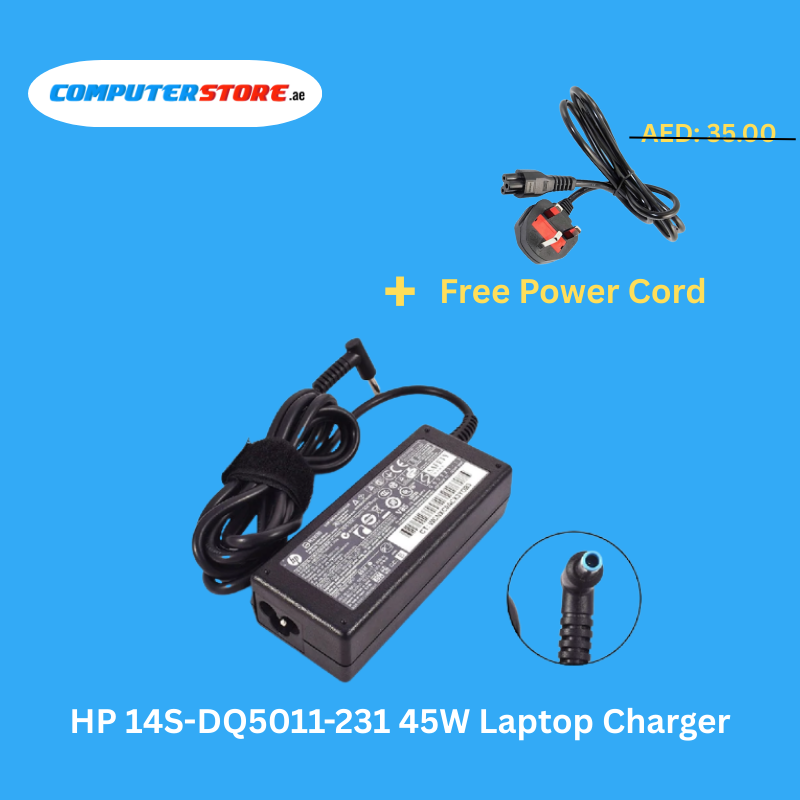 Reliable HP 14S-DQ5011-231 45W Laptop Charger with a free Power Cable, delivering stable 19.5V and 2.31A output for fast, safe, and efficient charging.