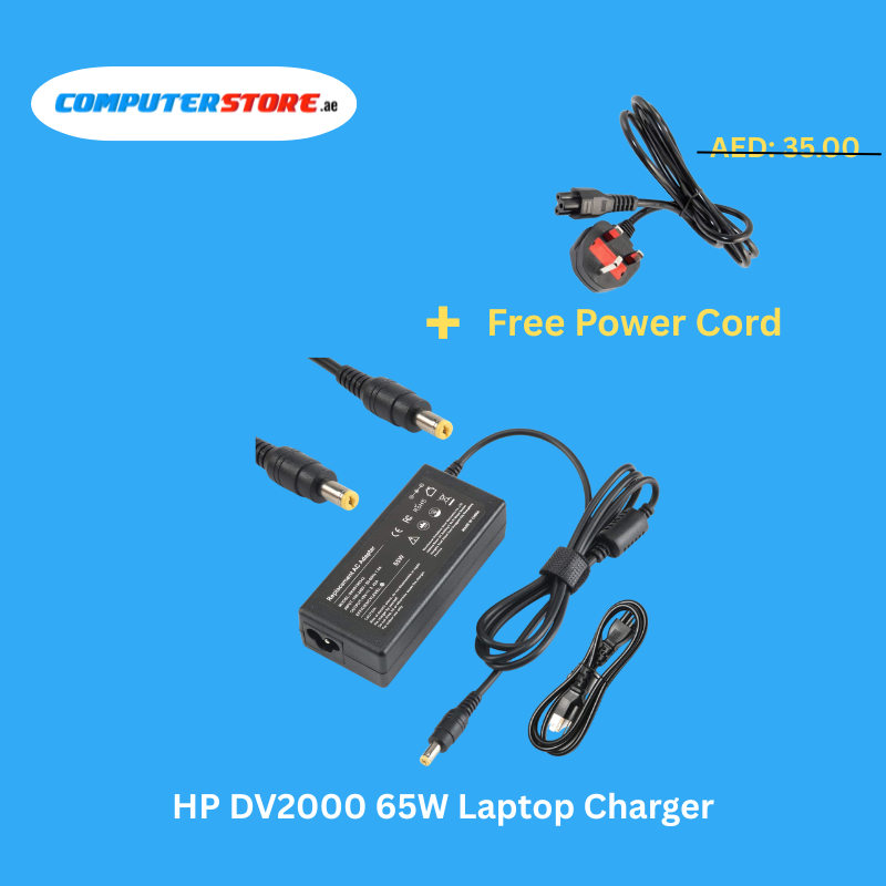 Efficient HP DV2000 65W Laptop Charger with a free power cable, delivering 18.5V and 3.5A output for reliable and smooth charging.