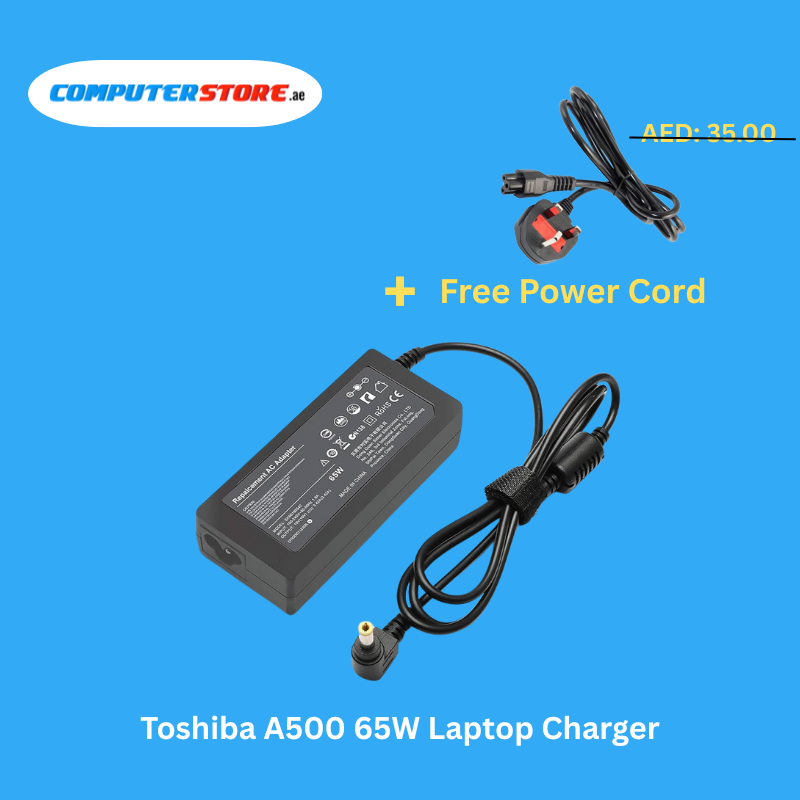 High-Quality Toshiba A500 65W Laptop Charger with a free power cable, ensuring steady 19V output with 3.42A current for reliable, efficient, and safe charging.